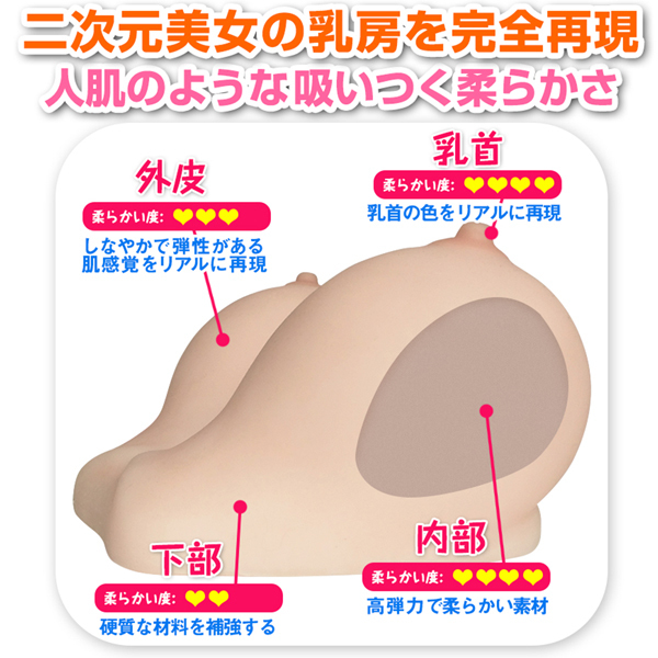 むっちりスベスベ極上の触り心地♪約1.75kgのGカップふわふわリアルおっぱい。無臭でベタつき無く滑らかな質感の特殊素材仕様で仕立てた弾力とハリのある人肌感で美女の乳房をリアルに再現!部位によって異なる弾力が本物と錯覚させます♪コリコリ乳首としっとり吸い付く柔らかな豊満Gカップを揉みしだき、思う存分パイズリしちゃってください!ローション付