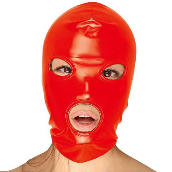 エナメル2wayストレッチ口アキ目アキ全頭拘束マスク レッド