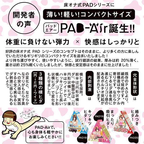 「体重に負けない弾力×快感はしっかりと」好評の床オナ式PADシリーズのコンセプトはそのままに、より多くの方に楽しんでいただけるギリギリのコンパクトサイズを追求いたしました!内部構造はややリアル寄りです。なだらかに下るヒダ道を奥に進むとコリコリ感のあるポルチオ突起が中盤上部に配置されています。内部刺激は、3種類の横ヒダで変化をもたせました!●日本製●ローション付