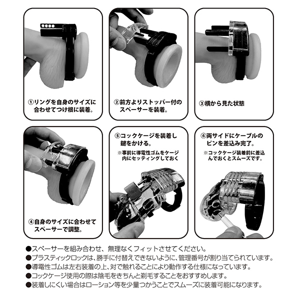 パッケージ:10.5×12.0×7.0cm 本体:ケージ内径3.2〜3.5cm・亀頭部の内径4.0cm・固定リング内径3.3〜5.2cm セット内容:コントローラー、コックケージ本体、導電性ゴム電極×2、スナップリング、スペーサー×4、金属製南京錠(鍵×2)、プラスティックロック×5、ケーブル 電池:単四電池×2本使用