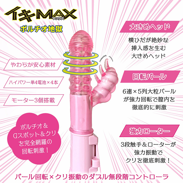 ポルチオ&Gスポット&クリトリスをマックス刺激!無間の快楽責めが続くポルチオ絶対主義バイブ!やわらかムチムチな安全エラストマー素材で初心者も安心・満足!大きめヘッドの8段もの横ヒダがもたらす絶妙な引っかかり挿入感!6連×5列の大粒パールが密着回転して、あそこを徹底的に刺激します。3段触手のついたクリバイブは、強力振動でクリを蹂躙。