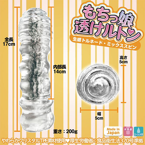 硬めでハード系なイメージを持つクリア素材の常識を覆す!素材はクリアでも固くない日本製の「やわらかクリスタルTPE」を採用した非貫通タイプのスケルトンオナホ「もちっ娘透けルトン」の生感トルネードミックススピンです。八連の山ミゾが波打ちながら螺旋のように絡みつき、全長17cmでオールクリアのボディは視覚的にも徐々にアソコが膨張していく様がわかるので興奮も刺激感も絶妙です♪全長17cmで幅5cmだからハンドリングしやすく、クリア素材なのに柔らかいので絡みつき感もしっかり楽しめます。重量200gでストローク感も充分!細身なのでグリップの強弱次第でダイレクトに刺激のコントロールが楽しめます♪ローション付。