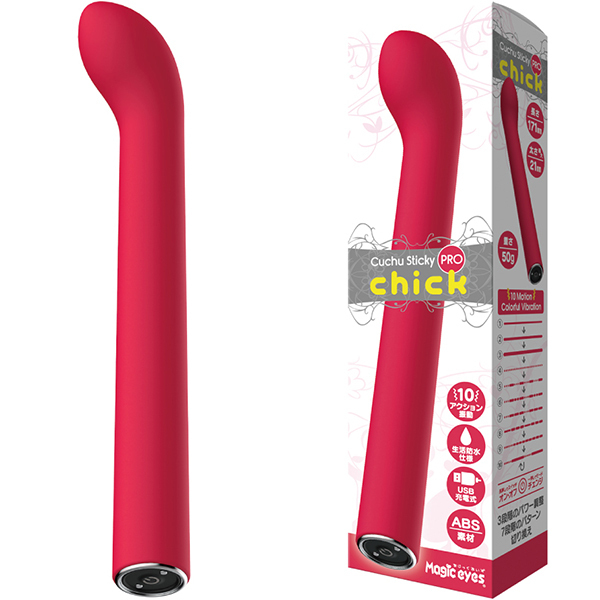 USB充電式なので電池交換の煩わしさもなく、Gスポット等の敏感な場所にもピンポイントで届く絶妙なサイズ感が嬉しいクチュスティッキーChickです。10モードもの振動パターンの中から自分の好みを選ぶことが出来、生活防水設計を搭載しているのでメンテナンスもカンタン♪マグネット式の充電用USBケーブルが付属しているのでご家庭の環境で届いたらすぐに充電が可能です。操作方法も簡単で電源スイッチの長押しでオン・オフができます!クリムゾンマットコーティングのボディは長さ171mmと十分なサイズ、太さ21mmは太すぎず、重さは50gと軽量なので、どなたでも気軽にお使いいただけます。