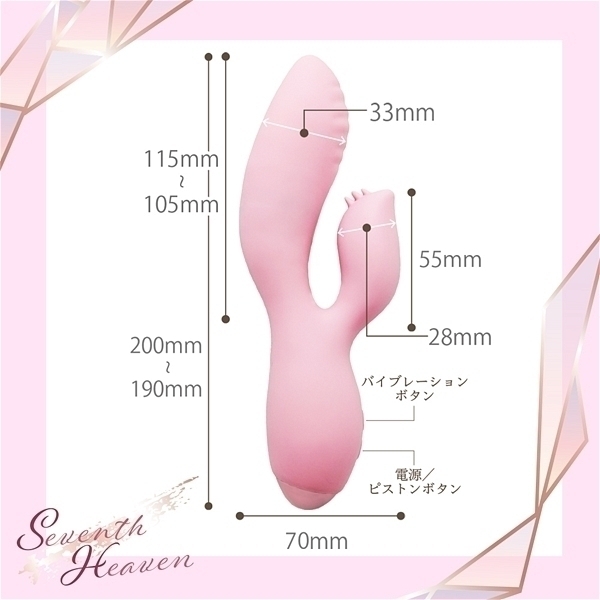 女性に寄り添う愛情バイブ「セブンスヘブン」繊細なウエーブを施したヘッドが、Gスポットをキャッチし7パターンの多彩なピストンで奥を丁寧に撫で上げます。クリバイブには3枚の小さなベロがついており、7パターンの小刻みなテンポでじわじわと刺激。弾力性が良いためクリを逃がさずしっかりフィットします。シリコン製なので、すべすべでなめらかな触り心地。