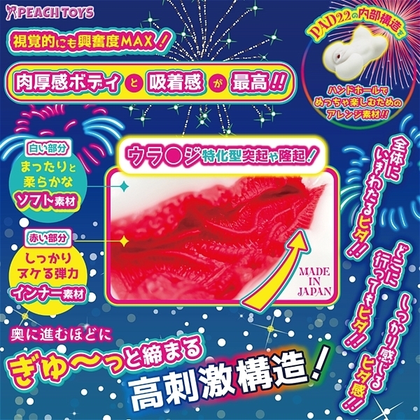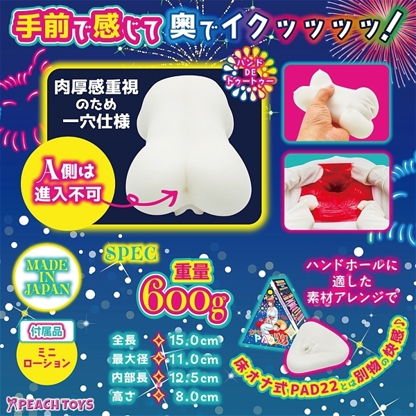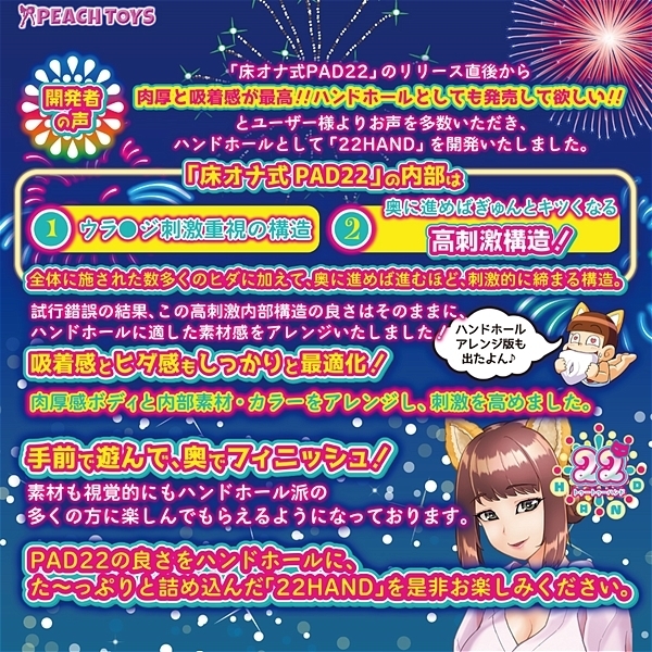 「床オナ式PAD22」の内部は、ウラ●ジ刺激重視の構造奥に進めばぎゅんとキツくなる高刺激構造!全体に施された数多くのヒダに加えて奥に進めば進むほど、刺激的に締まる構造。試行錯誤の結果、この高刺激内部構造の良さはそのままに、ハンドホールに適した素材感をアレンジいたしました!吸着感とヒダ感もしっかりと最適化!
