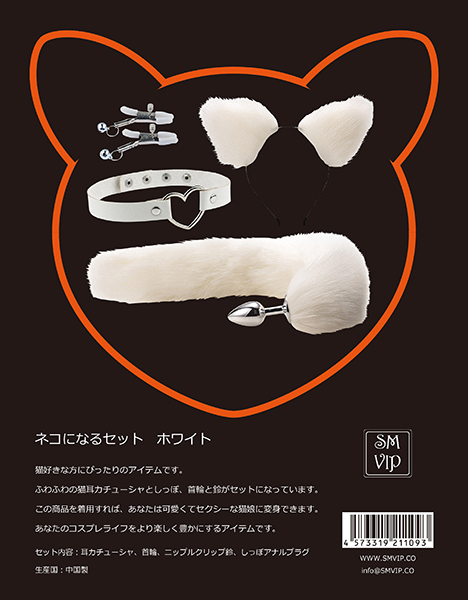 パッケージ:30.0×22.0×3.0cm 本体:耳カチューシャ約20cm×約20cm・首輪直径約12〜14cm・ップルクリップ(ハサミ口最大約1.6cm・長さ約5.6cm)・しっぽアナルプラグ直径約2.7cm・しっぽ長さ約40cm セット内容:耳カチューシャ、首輪、ニップルクリップ、しっぽアナルプラグ 原産国:中国 重量:本体135g