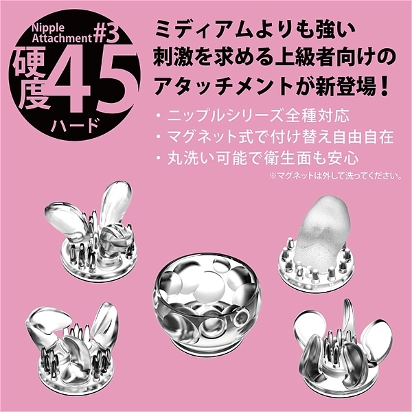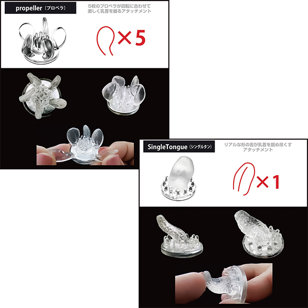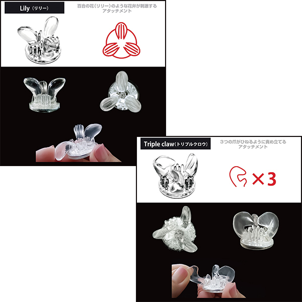 個性あふれる5種のアタッチメントを、両乳首に使えるよう、すべて2個ずつご用意。セットで使うもよし、あえて別々にして2人から乳首責めを疑似体験するのも一興です。●Lily(リリー)リリーの花をイメージした、外側にひらく花びら型のアタッチメント。●Triple Claw(トリプルクロー)内側に向かった3つのツメが特徴的なアタッチメント。●Propeller(プロペラ)5枚のプロペラが次々と乳首を刺激するアタッチメント。●Single Tongue(シングルタン)小さな舌が回転しながら舐め尽くすアタッチメント。●Ball Cup(ボールカップ)カップの中に大小さまざまのボールが不規則配置されたアタッチメント。●素材:エラストマー※直にお肌と接触する場合は、必ずローション(水溶性)をご利用ください。※こちらの商品はニップルドーム・カップシリーズの交換用アタッチメントです、商品単体ではご使用いただけませんのでご注意ください。