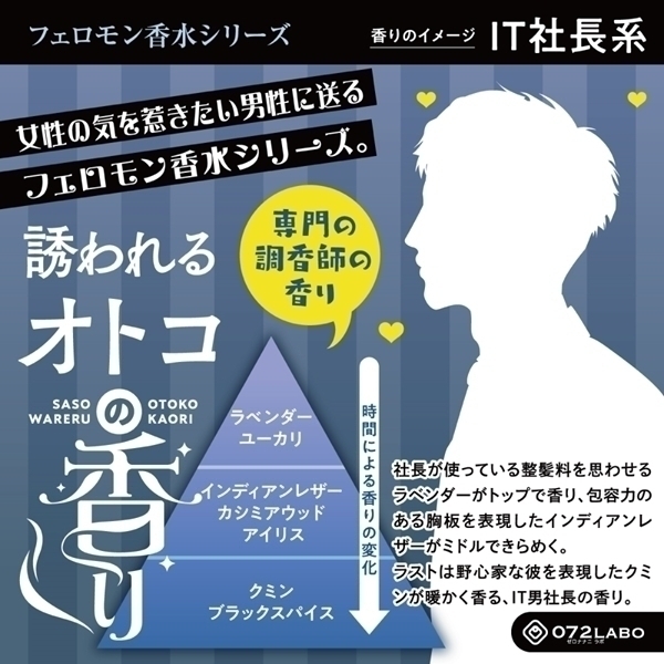 専門の調香師にフェロモンを感じる香りとはなにかを分析してもらい相手を魅了する香りに仕上げました。気になるあの人へ魅惑的で官能的なアピールでオトナな夜をお楽しみください。●IT社長:社長が使っている整髪料を思わせるラベンダーがトップで香り、包容力のある胸板を表現したインディアンレザーがミドルできらめく。ラストは野心家な彼を表現したクミンが暖かく香る、IT男社長の香り。スプレータイプ。