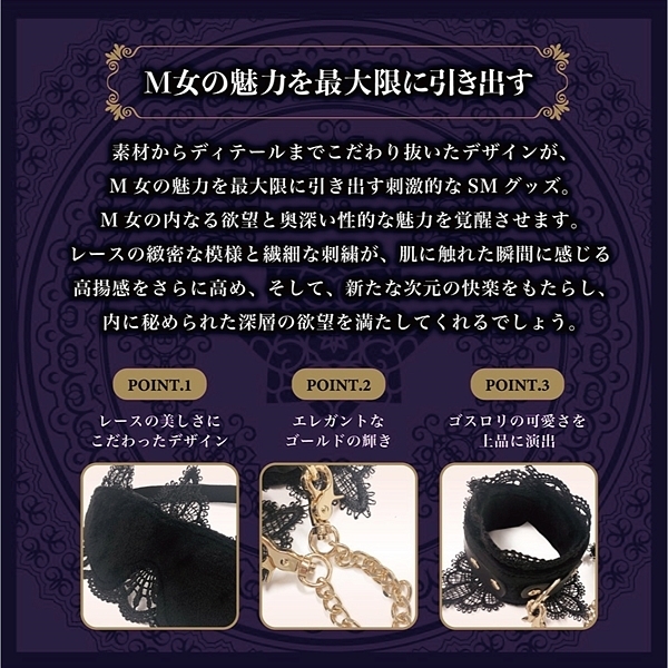 アイマスク、口枷、手枷の3点セット。非日常を体験するのにチープ物では気持ちも盛り上がりません。高級感あるベロア生地とレースで飾りつけた心の奥のM願望を刺激してください。