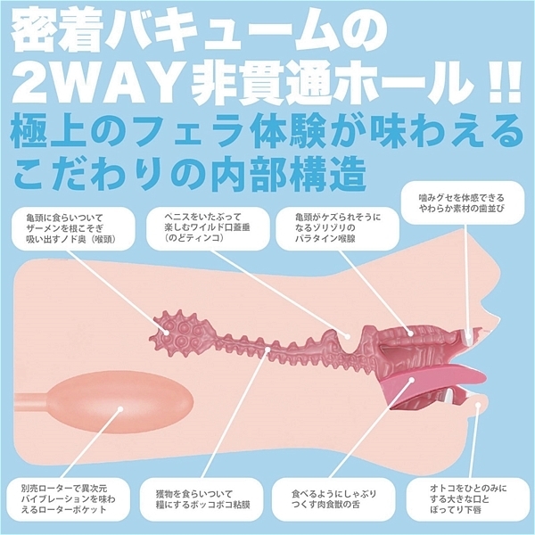 肉食系AV女優<石原希望>。本人の完全監修によって、肉食フェイスから、つよつよのノドまでをリアル再現。500gクラスの肉厚密着感と、人工粘膜による2層構造、そして趣向を凝らした口腔ギミックにより<石原希望>のむさぼるような貪欲フェラを体感できるのです。電動の快感を楽しみたい人には、ローターポケットを標準装備。