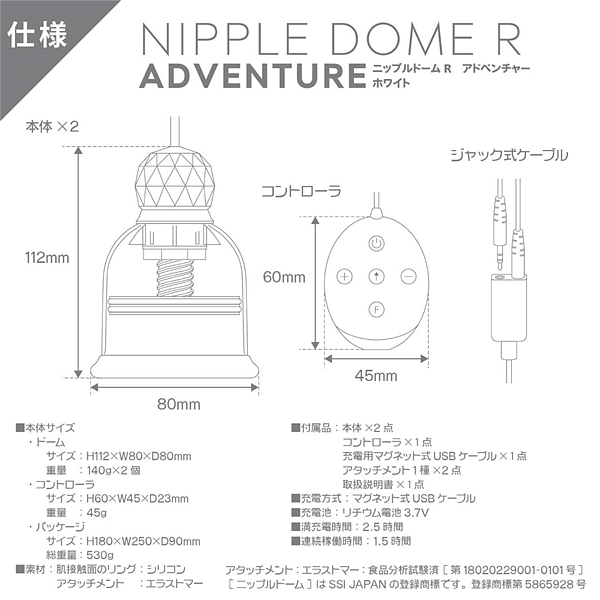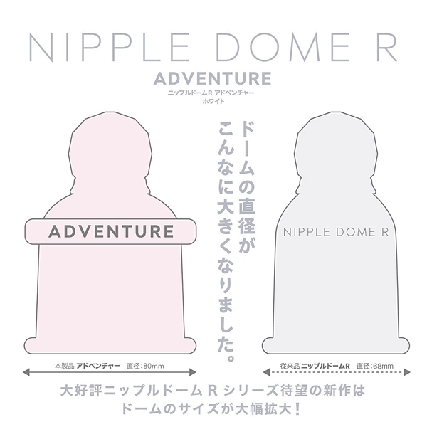 ドームの直径を1.2cmも拡大し、日本女性のほとんどのバストトップをカバーしています。女性にも男性にも幅広いファンを持つ、乳首開発の定番グッズが、ますますユーザー層を拡大すること間違いなし。従来の「ニップルドームR」と機能はまったく同じなので、長年の愛好家もご安心ください。アタッチメントの根元まで押しつけた乳首を深くねぶって停まらない高トルクも健在。