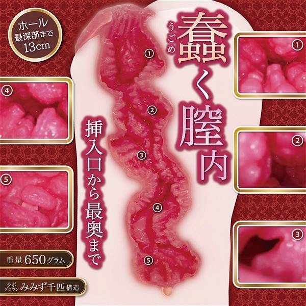 挿入口から最奥まで蠢(うごめ)く膣内。「ひめはじめ」は名器の代表格「みみず千匹」の再現がコンセプトのオナホールです。開発目標としたのは「うねうねと旋廻し、まとわりつく粘膜」の具現化。この使用感を実現されるため「蛇腹の太ヒダ」を不規則に絡ませ、挿入口から最奥まで「びっしりと螺旋状」に巻きつけました。