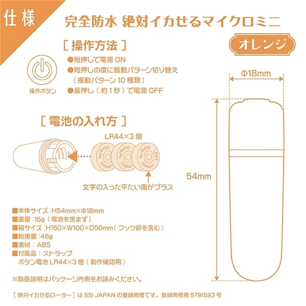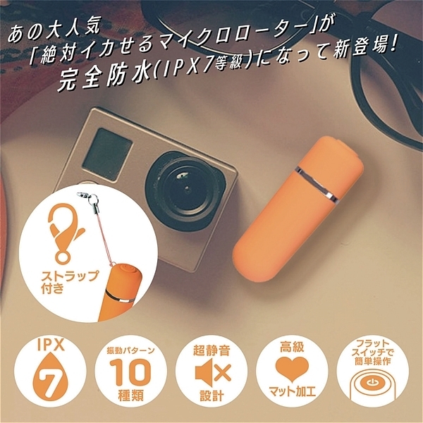 あの絶対イカせる極小ローターが完全防水(IPX7)に大変身!完全防水(IPX7)になって新登場。どれだけ濡らしても安心で、お楽しみ後は丸洗いOK。振動パターンは、なんと10種類!大人の親指くらいしかない超マイクロサイズなのに、とってもハイパワー。しかも超静音設計●素材:ABS●防水レベル:完全防水(IPX7)●カラー:オレンジ