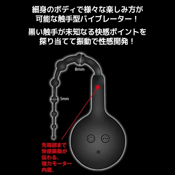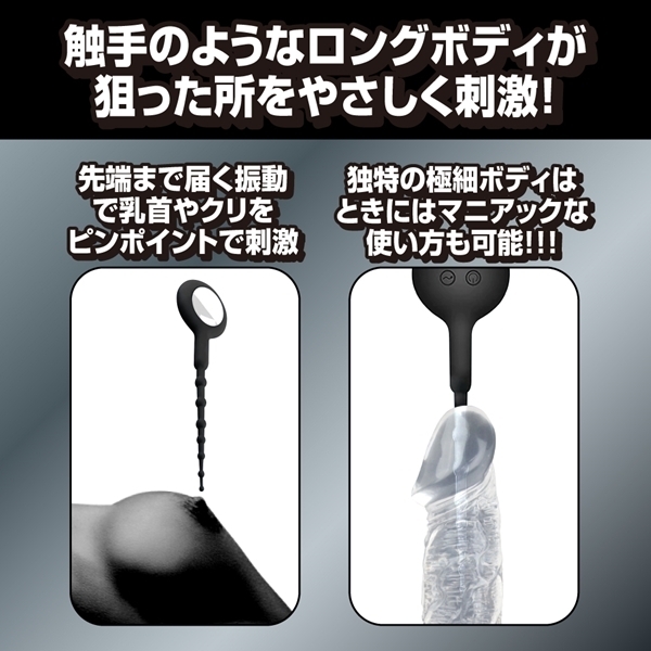 極細のボディで様々な楽しみ方が可能な触手型バイブレーター<ブラックテンタクル>に、サイズを小さく!触手の部分に突起を施した、セカンドバージョンが新登場!黒い触手が未知なる快感ポイントを探り当て、振動で性感開発!触手部分に施された複数の突起が、更に心地よい刺激を与える!独特な極細ボディは全身の敏感部分を表面から刺激するもよし、マニアックなところを刺激するもよしな、無限大の可能性を秘めた万能ローターです♪