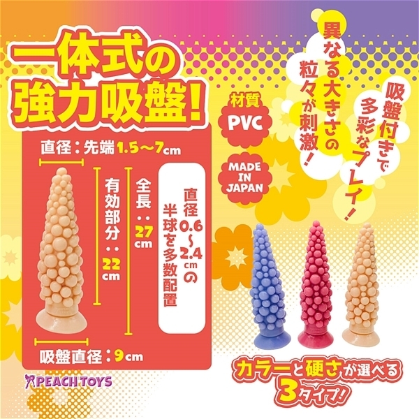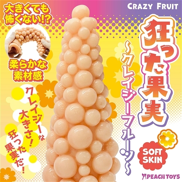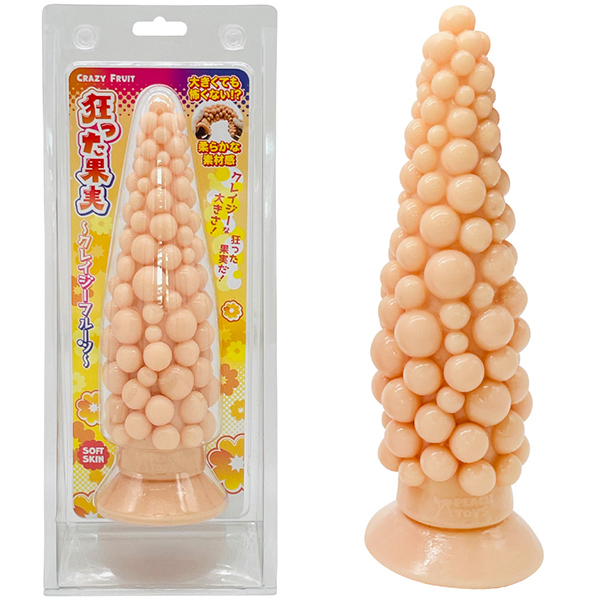 クレイジーな大きさ!狂った果実だ!『狂った果実 クレイジーフルーツ』の登場です。異なる大きさの粒々が刺激!全長27cmの巨大ディルド。先端は小さく、段々と広がる円錐形状に大きさの異なる粒々がランダムに配置!直径0.6〜2.4cmの半球を多数配置●カラーと硬さが選べる3タイプ!<ソフトスキン>肌色のソフトタイプ。大きくても怖くない!?