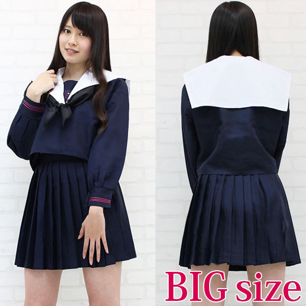 BIGサイズ:B114cm程度・W71〜89cm 丈:上着51cm(袖丈56cm、肩幅45cm)・スカート45cm・スカーフ120×93×93cm セット内容:上着(横ファスナー、襟・袖に3本ライン入り(赤色)、胸当てに校章入り(赤色)、胸ポケット縫い付け、襟当て(白色)取り外し可)・スカート(横ファスナー、アジャスター有り)・スカーフ・襟当て