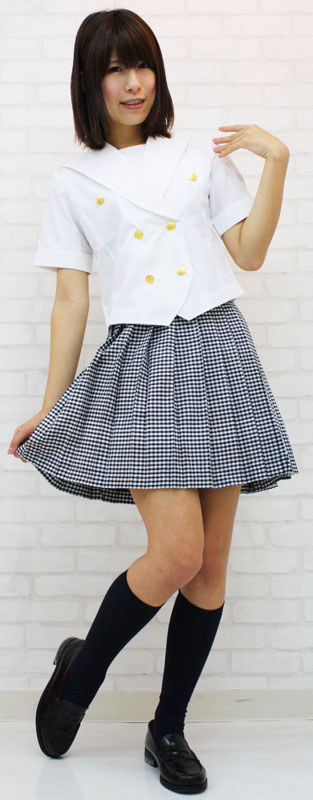 BIGサイズ:B88〜100cm・W76〜85cm 丈:上着54cm(袖丈26cm、肩幅39cm)・スカート45cm セット内容:上着(ピケ生地使用、前ボタン留め、金ボタン、左袖に校章付き)・スカート(横ファスナー、アジャスター有り、黒ギンガムチェック生地)