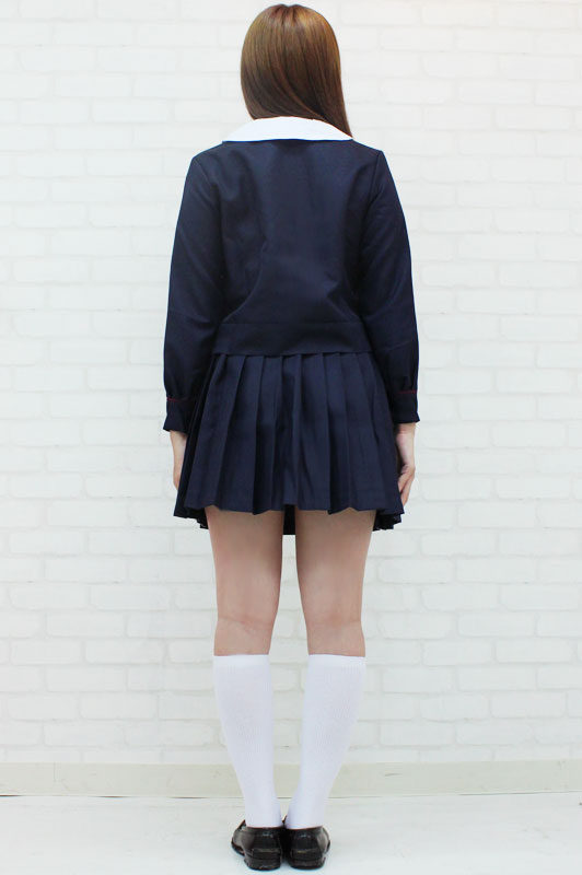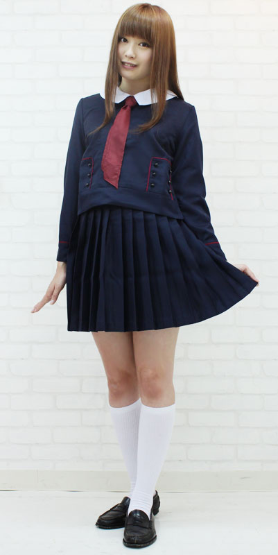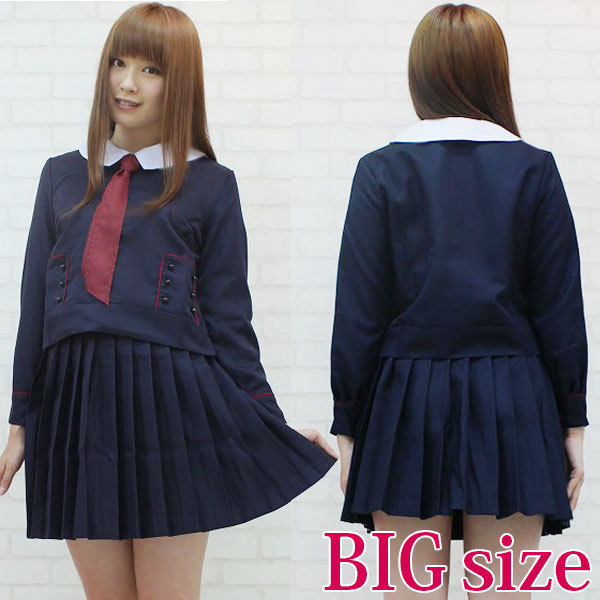 白襟とエンジ色のスカーフがベストマッチ!可愛い濃紺の制服コスプレセット(BIG)。丸首が可愛い冬服タイプのトップスはサイドファスナー仕様、白襟はスナップボタンで取り外し可能!トップス両サイドにはエンジ色のパイピングの中に、6つのボタンをあしらった飾りポケット付き!プリーツスカートはアジャスターで調節可能です。素敵なお嬢様を思わせる、デザイン性に富んだ大きめサイズの制服コスチュームセットです。※水洗い不可、塩素系漂白剤による漂白不可、アイロンは中温で当て布使用、ドライクリーニング可、色落ちの可能性があります。※こちらの商品は在庫の状況によりお届けまでに4日〜7日程度かかる場合がございます。
