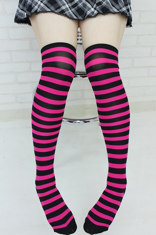 コスチュームのアクセントに!ピンク×ブラックのボーダー柄ニーハイ。1cm幅の細めボーダーがとってもキュート!コスプレ衣装はもちろん、私服にもコーディネート出来ちゃう優れもの!ヘビロテ確実のしましま柄ニーハイソックスです。