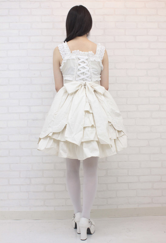 プリンセスのようなふんわり感で可憐にドレスアップ!後ろ姿も可愛いオフホワイトのジャンパースカート(M)。胸元の大きなリボンがワンポイント!リボンはピンで取り外しが出来るので、お好きなアレンジが楽しめます。バックの編み上げデザインとティアードフリルのスカートが、ふんわりキュートな女の子を演出するラブリーなコスチュームです。※水洗い不可、塩素系漂白剤による漂白不可、アイロンは中温で当て布使用、ドライクリーニング可、色落ちの可能性があります。※こちらの商品は在庫の状況によりお届けまでに4日〜7日程度かかる場合がございます。