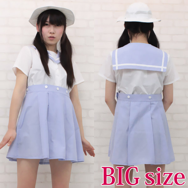 昔懐かしいゴム付き帽子もセット!淡いブルーが爽やかな夏服タイプの制服コスプレ(BIG)。セーラー襟の付いた半袖シャツとスカートは、ボタンで繋ぐことが可能!こだわりデザインのキュートな制服コスチュームです。※水洗い不可、塩素系漂白剤による漂白不可、アイロンは中温で当て布使用、ドライクリーニング可、色落ちの可能性があります。※こちらの商品は在庫の状況によりお届けまでに4日〜7日程度かかる場合がございます。