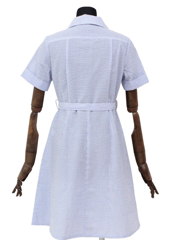 水色と白のストライプ柄がとっても涼しげな盛夏服タイプの制服コスプレ(M)。●ワンピースは前ボタンで一人でも簡単に着脱OK●ベルト付き(長さ調節可)●胸当てスナップボタン付き●スカートポケットあり。胸ポケットにさり気なく施された刺繍がオシャレ!お嬢様気分を味わえちゃう清楚な制服コスチュームです。※水洗い不可、塩素系漂白剤による漂白不可、アイロンは中温で当て布使用、ドライクリーニング可。※こちらの商品は在庫の状況により、お届けまでに4日〜7日程度かかる場合がございます。