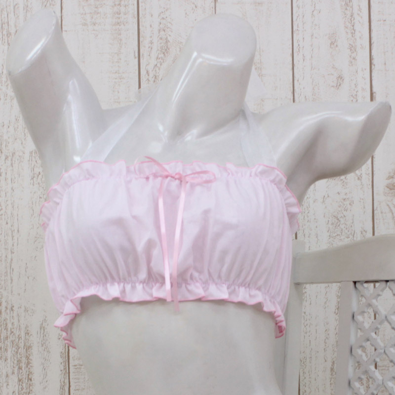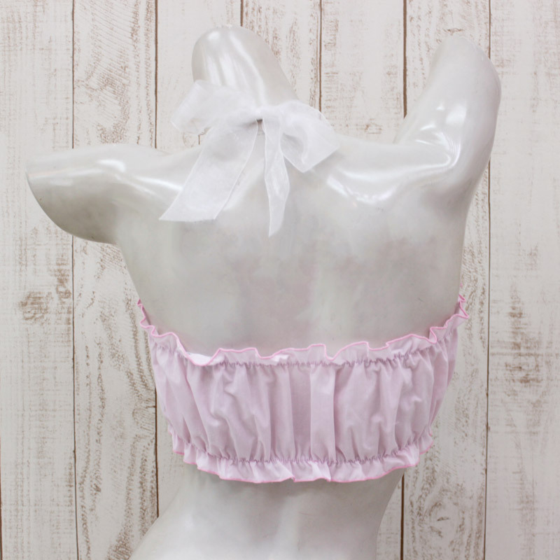 ロマンチックな気分になれそう♪乙女度高めなチューブブラ。●ふんわりパステルピンク×ホワイト●バストをすっぽり覆うチューブ型●上下にたっぷりフリルギャザー入り●フロント真ん中に繊細リボンをON●ホルターネックはオーガンジーリボンで可愛らしく。ピンクとホワイトのスウィートカラーで女の子らしさ急上昇!まるでプリンセスのナイティのようなヒラヒラ感で、お揃いショーツ(cm1002)とあわせればコスチュームの見せインナーとしても活躍してくれそうです。※水洗い不可、塩素系漂白剤による漂白不可、アイロンは中温で当て布使用、ドライクリーニング可。※こちらの商品は在庫の状況によりお届けまでに4日〜7日程度かかる場合がございます。