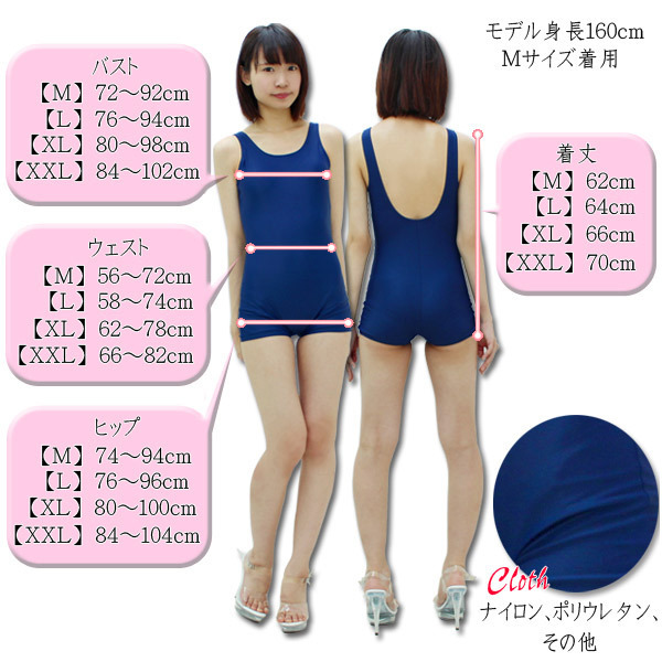 Lサイズ:B76〜94cm・W58〜74cm・H76〜96cm 着丈64cm セット内容:水着単品(前身頃全面に裏地付き、胸部にパット付き) 素材:ナイロン、ポリウレタン、その他