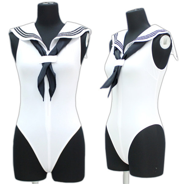 BIGサイズ:B84〜106cm・W74〜98cm・H76〜100cm 着丈65cm セット内容:レオタード(前ファスナー)、スカーフ(マジックテープ) 素材:ポリエステル95%、ポリウレタン5% セーラーノースリーブレオタード 色:白