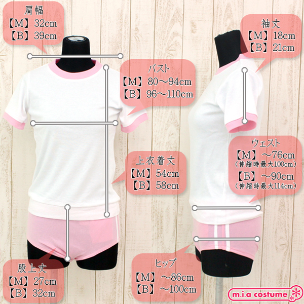 Mサイズ B80〜94cm・W〜76cm(伸縮時最大100cm)・H〜86cm 上衣:着丈54cm・肩幅32cm・袖丈18cm ブルマ:股上丈27cm セット内容:上衣、ブルマ 素材:ポリエステル65%、コットン35%