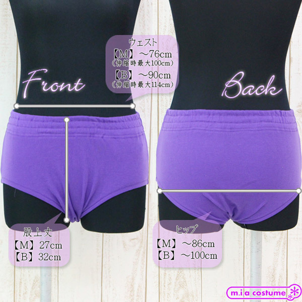 Mサイズ W〜76cm(伸縮時最大100cm)・H〜86cm ブルマ:股上丈27cm セット内容:ブルマ単品 素材:ポリエステル65%、コットン35%