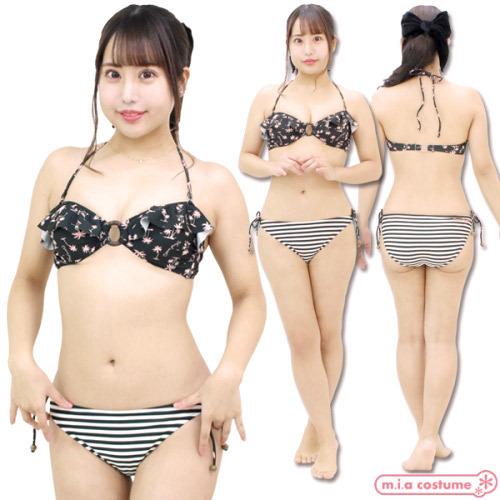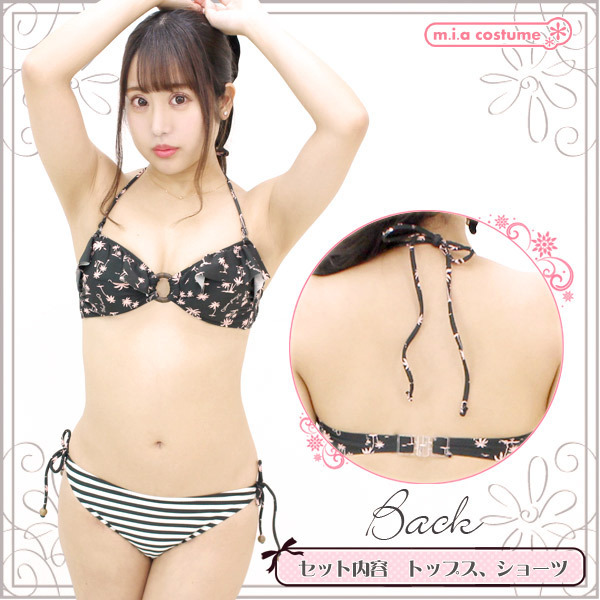 9Mサイズ:B83cm・H87〜95cm セット内容:トップス(パッド着脱可、ワイヤー無し)、ビキニショーツ 素材:ポリエステル85%、ポリウレタン15% 生産国:日本