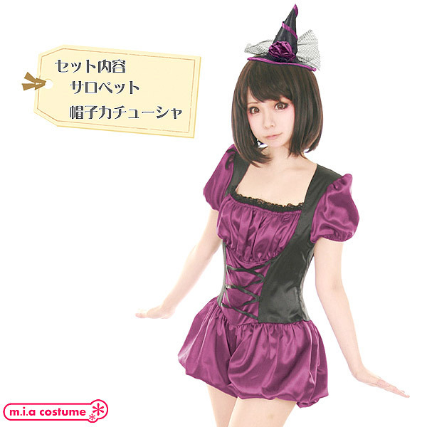 小さな三角帽子がチャーミング♪サテン風の艶やかな生地を使用した、黒×パープルのダークポップな可愛い魔女コスプレ。かぼちゃパンツデザインのサロペットが元気でキュートな魔女っ娘に演出!ハロウィンナイトにピッタリな可愛いコスプレです。※塩素系漂白剤による漂白不可、洗濯の際はリボンなどの付属品を外し個々単独での手洗いをお願いします、色落ちの可能性があります。※こちらの商品は在庫の状況によりお届けまでに4日〜7日程度かかる場合がございます。