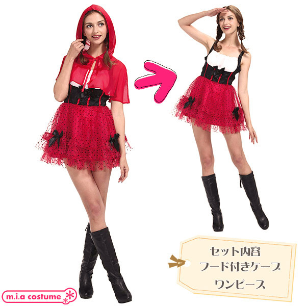 一味違った赤ずきんコスプレで周りと差をつける!ドット柄のチュールスカートと黒リボンで可愛く仕上げたコルセット風ミニスカワンピース。涼し気なシースルー素材のフード付きケープをプラスして甘辛風な赤ずきんちゃんに変身♪ハロウィン仮装や文化祭の衣装に◎背面ファスナー式&スカート裏地有り※色落ち防止のため塩素系漂白剤での漂白&水洗い不可※水洗い不可、塩素系漂白剤による漂白不可、アイロンは中温で当て布使用、ドライクリーニング可、色落ちの可能性があります。※こちらの商品は在庫の状況によりお届けまでに4日〜7日程度かかる場合がございます。