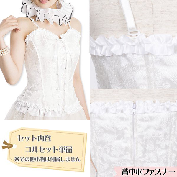 メイド服やロリータ、ゴシックコーデに欠かせないコルセットがプチプラで買える!骨を内蔵した純白カラーの花柄レースアップコルセット単品。見た目をシュッと綺麗にスタイルアップ!女性らしいくびれを作り、フリルや花柄模様で華やかな印象を与えます。フロントの編み上げを調整することでサイズ調整も可能◎Fサイズ※洗濯不可、塩素系漂白剤による漂白不可、アイロン不可、ドライクリーニング不可※こちらの商品は在庫の状況によりお届けまでに4日〜7日程度かかる場合がございます。