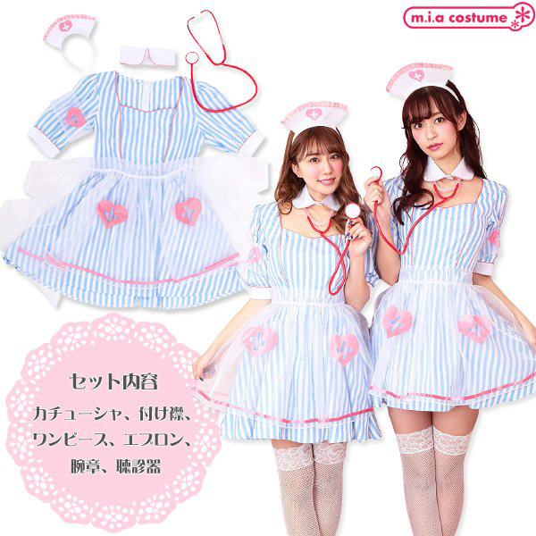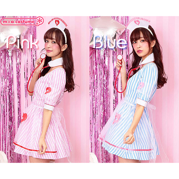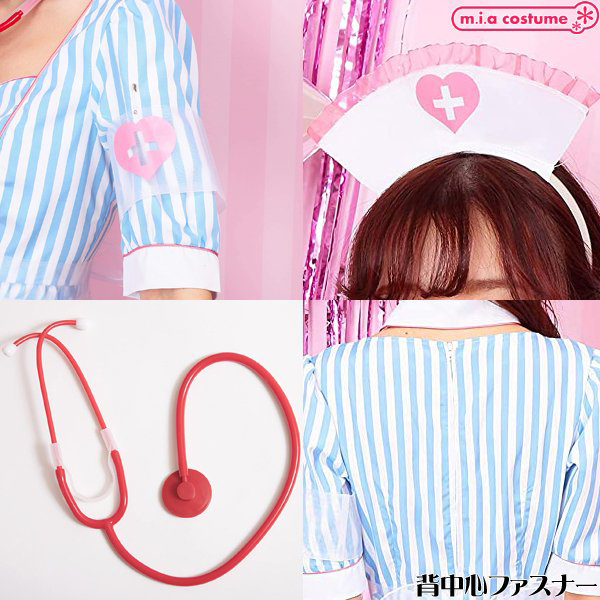 仮装コスプレのなかでもファッションにこだわりたいならこちら♪ストライプ生地にオーガンジーの透けた紋章とエプロンが可愛いブルーソーダナース(衣装)です。聴診器が付いていてセット内容は充実の6点セット♪付け襟と開いた胸元が艶やかで、写真映えすること間違いなし!ハロウィン用のコスプレはもちろん仮装イベントやキャバコスとしてもどうぞ♪※洗濯不可、塩素系漂白剤による漂白不可、アイロンは中温で当て布使用(プリント部分のアイロンはお避け下さい)、ドライクリーニング不可