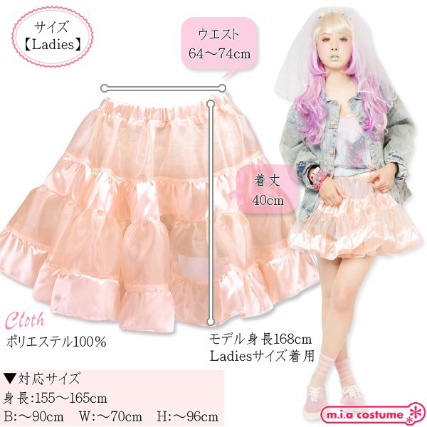 イベント用のコスプレやパーティー用としても良さげなコスプレです♪サテンの光沢感とシースルー素材の組み合わせがとても可愛いティアードスカート!重ねるボトムスで様々なコーディネイトを楽しみつつ、甘いベビーピンクが優しい印象を与えてくれます♪ふんわり広がるガーリィな印象とシルエット。原宿系ファッションとしてもポイント高めです♪※洗濯機不可、弱い手洗い可、塩素系漂白剤による漂白不可、アイロンは中温で当て布使用、ドライクリーニング不可