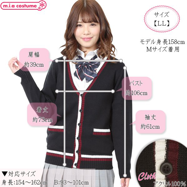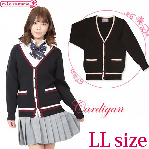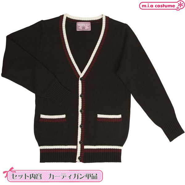 制服コスプレや普段使いにも♪配色ラインをスッと効かせて、メリハリ良く仕上げた柔らかく肌触りのよいニットカーディガンです。V字形にスッキリと開いたネックは、ネクタイなどの小物使いも良く映えます♪ボタンはニットと同色に染めていて、左右にポケットが付いているから着回しも抜群!寒い季節や制服コスプレに欠かせないアイテムです♪※液温30℃限度、洗濯機の弱水流又は弱い手洗いが良い、塩素系漂白剤による漂白不可、アイロンは低温で当て布使用、石油系ドライクリーニング可、日陰のつり干しが良い、洗濯用ネットに入れてニット用中性洗剤で洗濯してください。