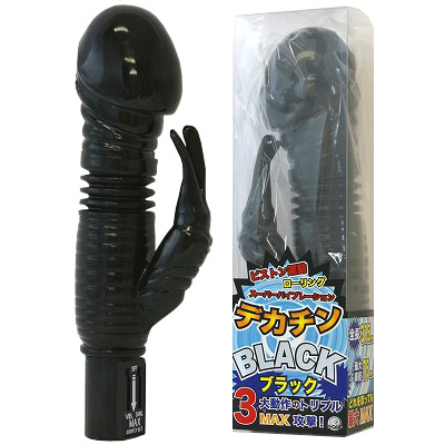 三度の飯より巨根好き!…という貴女に持ってこいの超超超極太モンスターバイブ!その名も「デカチンBLACK」。全長315mm、最大直径75mmという見た目の迫力もさることながら、機能面においてもピストン運動&ローリング&スーパーバイブレーションのトリプルMAX攻撃が可能!挿入せずに快感ポイントに当てるだけでもKO確実!