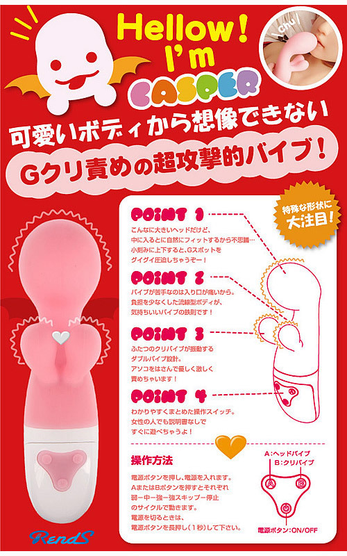 思わずキュンとしちゃう!可愛いデザインからは想像もつかないほどの力を発揮するバイブレーター「キャスパバイブ」。安心安全なシリコン素材を採用!巨大ヘッドバイブでGスポットを刺激しつつ、2つのクリバイブでクリを挟んで楽しむ、デザインも使い方も新しいアイテム。持ち手部分にある3つのボタンスイッチで、ON・OFFから4種類の振動まで簡単に操作できます。アナタがまだ知らない、未知の刺激と快感がたっぷり味わえるバイブレーターです。単三電池×2本付属。