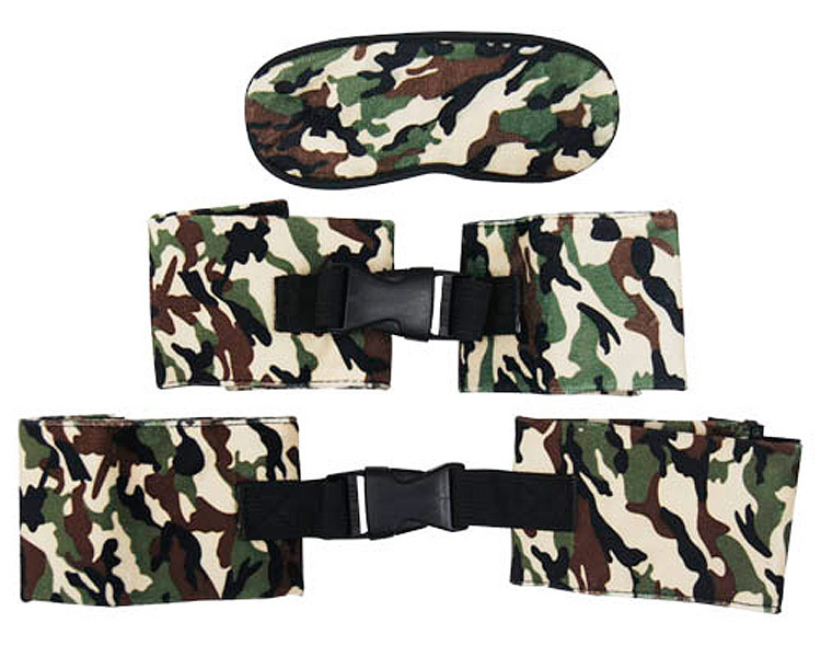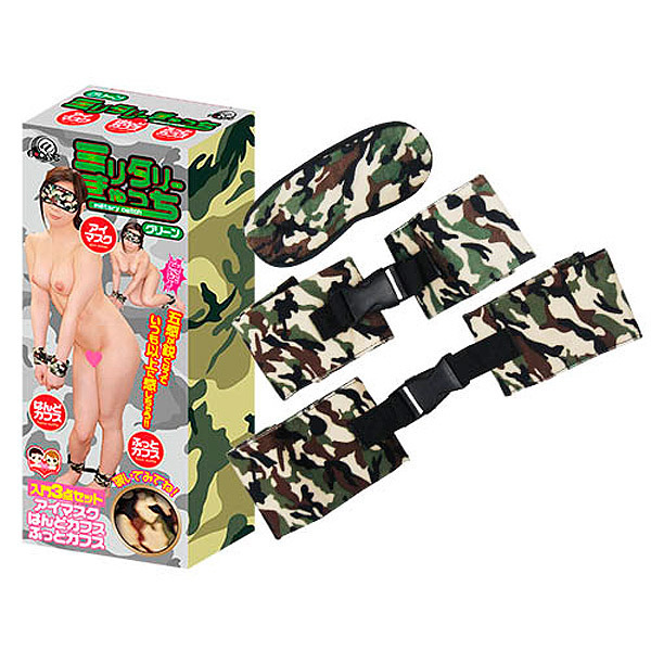 ミリタリーマニア必見!カモフラ柄が可愛いSM拘束セット。●肌に優しいふかふか起毛●定番グリーンのカモフラージュ柄●男女とも使用OKなフリーサイズ●視界をしっかり遮るアイマスク●手枷・足枷の留め具は面ファスナー●「手×手」「手×足」など組み合わせ自由なジョイント接合。パートナーの視界と手足の自由を奪ったら、次はどうする?思わず興奮しちゃうワクワク要素たっぷりなSMセット。刺激が足りないカップルさんにもおすすめです。