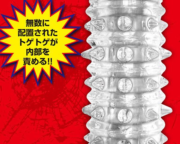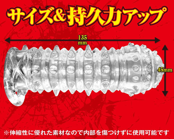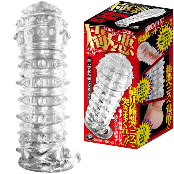 ワイルドすぎる挿入感!刺激度高めの肉食系「極悪ストロングサック」。●先端まで全て覆うオールカバー。●肌が透けて見えるクリアタイプ。●玉掛けリング付きで安定感抜群。●最大径45mmのビッグサイズ仕様。●高い伸縮性素材で装着ラクラク。●たっぷりトゲ突起が全体を覆う。●優しくソフトな弾力の絶妙刺激。●手軽にサイズ&持続力UP。みっちり敷き詰められた三角突起で内部をジョリジョリと攻撃しまくる高刺激系。見た目のわりにソフトな感触で傷つけることなく、尚且つベストすぎる刺激で快感を与えます。