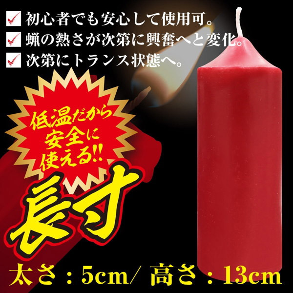ロウの熱さが次第に興奮へ…!安全かつ本格的なSMプレイを楽しめる「低温ロウソク(長寸)」。●どっしり安定感のある太め蝋燭●高さ13cm、太さ5cmの長寸タイプ●低温でロウが溶ける安心仕様。SM初心者さんでも安心♪ロウを溜めやすく垂らしやすい太めのSM蝋燭!初心者の方から上級者の方まで本格的なムードたっぷりのSMプレイをお楽しみいただけます。緊縛事故防止の教育・啓発を行うNPO法人BDSMセーフティーサポート協会代表の女緊縛師「青山夏樹」推薦!安心・安全に使用できるSMグッズです。【ご使用上の注意】落下させる環境や高さなどにより、体感温度は異なります。火の取り扱いや火災・火傷には十分にご注意下さい。炎を直接肌に触れさせないで下さい。直射日光の当たらない涼しい場所で保管して下さい。