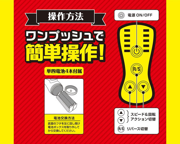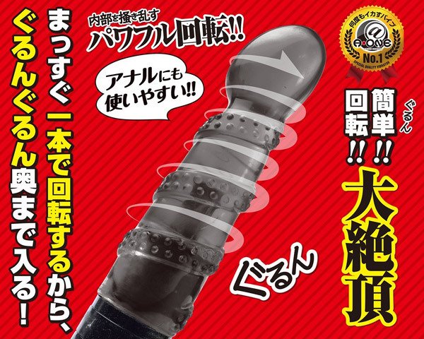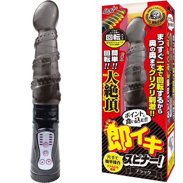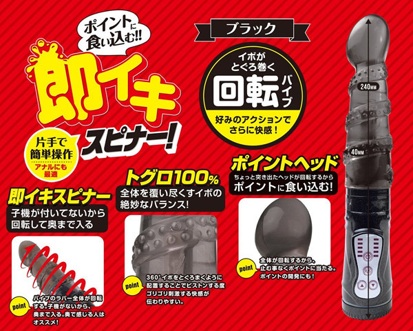 簡単、回転、大絶頂!内部を掻き乱すパワフル回転バイブ「即イキスピナー! ブラック」。ラバー全体が回転するストレート形状のスイングバイブ!クリバイブの無い一本式なのでぐるんぐるんと奥まで入り、ポイントヘッドがGスポットに食い込みます。さらに、トルネード状に配置したイボが回転することで360°ゴリゴリ刺激します。片手で操作できる簡単仕様でアナルにも最適です。単四電池×4本付属。