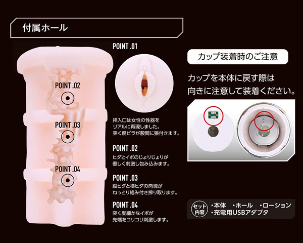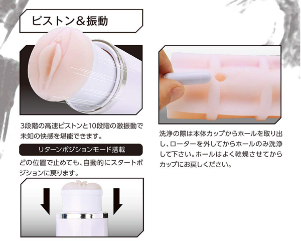握力いらずで快感に集中できる、驚異のハイパワーを実現したピストンオナホ!ダブルの刺激とハイパワーが自慢のピストンモードを搭載したカップ型の電動オナホは他に類を見ません♪3段階の高速ピストンと10段階もの激振動で、これまでにない未知の快感を体感できます!本体上部の空洞部分には親指を通して固定できるので、握力をさほど使わずに使用可能。付属のホールはリアルな形状で、挿入口付近はヒダとイボのジョリジョリが貴男の息子を優しく刺激♪縦ヒダと横ヒダの肉塊とねっとり絡みつく快感、突く度に先端を襲うイボによるコリコリ刺激がたまりません!ご使用後はホールを取り外して洗浄可能♪電源はUSB充電式で、4時間の充電で約40分の連続使用が可能です。