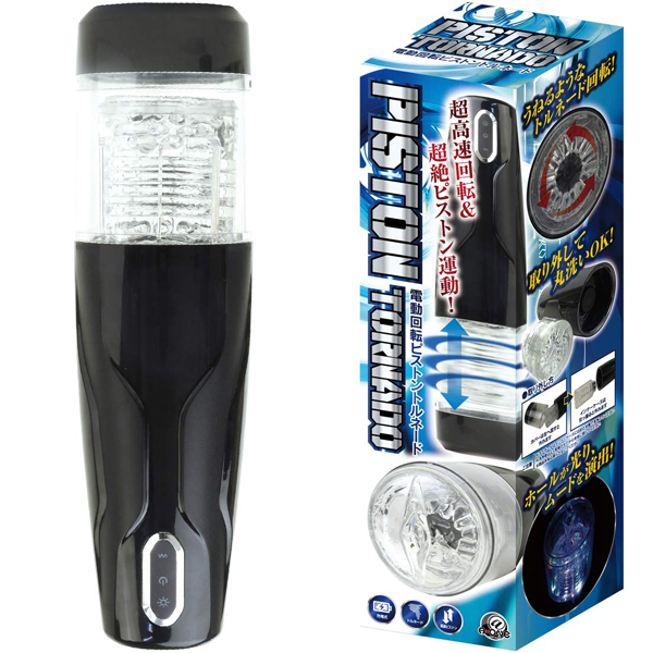 超高速回転&超絶ピストン!!ピストントルネードが、電動オナホールに旋風を巻き起こす!!挿入してボタンを押せば、回転&ピストンスタート。うねるようなトルネード回転が、亀頭や竿を刺激。10種類の超快感に、キミは耐えることができるか?ホールは取り外して丸洗いOK。ライトボタンを押せば本体内部が光り、ムードを演出。驚愕の快感を堪能せよ!!
