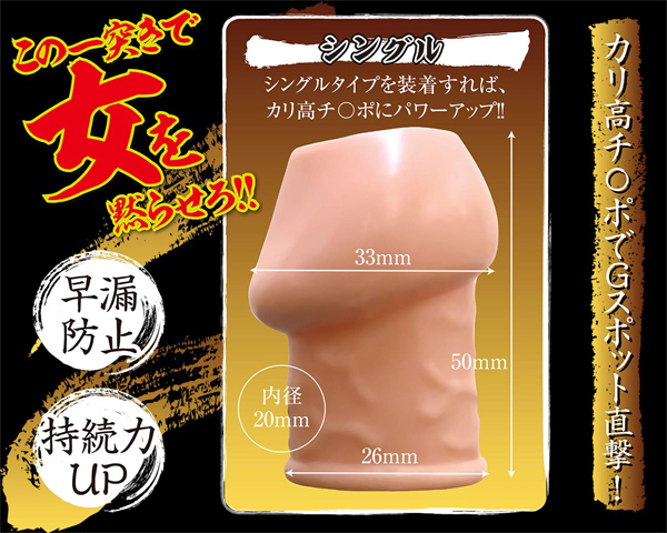 自身のカリクビを強化。Gスポットを刺激するカリキャップシリーズ。早漏抑制&持続力アップ!!シングルタイプを装着すればカリ高チ〇ポにパワーアップ。膣内を掻き回せし、情熱的な一突きで女を黙らせろ!!