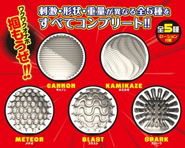 ぶっちぎりの快感!!カプセルにオナホが入ったガチャホール。刺激・形状・重量の異なる全5種類で登場!!【キャノン】スタンダードなねじ切りタイプ。細かいヒダヒダが竿を刺激【カミカゼ】いくつもの細かな凹凸をトルネード上に配置【メテオ】無数のイボ突起が、流星の如く襲い掛かる【ブラスト】ウェーブ状に配置された突起が、カリ首を咥え込む。【スパーク】ヒゲ状の突起がくすぐりながら弾けて刺激。ディスプレイ用としても使用可能なBOXに5種×5個の計25個入った状態で発送いたします。ガチャマシーンに入れて販売することも可能ですが、カプセルにはバーコード付きフィルムが巻かれているので店頭での販売も可能です。