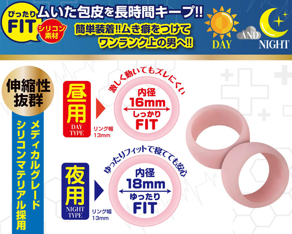 ムいて、付けて、包皮を長時間キープ!使い心地なめらかで伸縮性抜群な包茎矯正リングが2本セットで登場。内径サイズの異なるシリコン素材のリングが2本ついているので自身のサイズやシーンに合わせて使い分けられる!ムき癖をつけてワンランク上の男へ…いざ、未知なる世界へ!<昼用タイプ>激しく動いてもズレにくい!しっかりフィットタイプ!<夜用タイプ>寝たまま付けても安心。ゆったりフィットタイプ!<使用方法>包皮をムいて、カリクビの付け根に装着するだけ。2つのリングはお好みに合わせてご使用ください。※リングを引っ張りすぎるとリングが切れる場合がございますのでご注意ください。