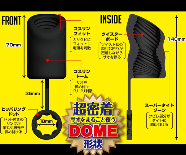 あのコスリングがパワーアップして帰ってきた!手コキ以上の快感×オナホ以上の衝撃が押し寄せる…ッ!新感覚オ〇ニーグッズ第2弾!!睾丸や根元を締め付けるリングはドット付きに進化し早漏防止&勃起力UP!!竿をまるごと覆う超密着なDOME形状が全体を包み込みハードに締め付ける!ツイスト状の凹凸がゴリゴリと責め、内部のクビレ部分が単調ではない刺激を生み出します。自由に擦るだけで最高の射精感、まさにストライクな一撃!普通の手コキでは得られない圧迫感、オナホの煩わしい後処理にサヨナラ!